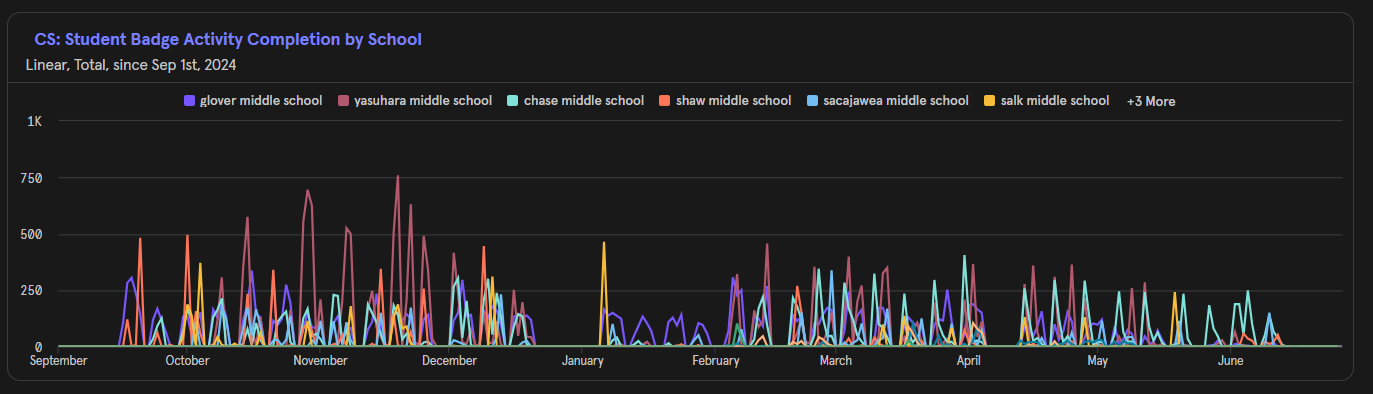As of the end of this school year, we had 862 students complete over 65,000 badge activities. That really feels like exceptional engagement from our students and teachers. It also feels like a valuable picture of what a school district’s Return on Investment (ROI) can look like from a collaborative partner like the Find Your Grind Team.