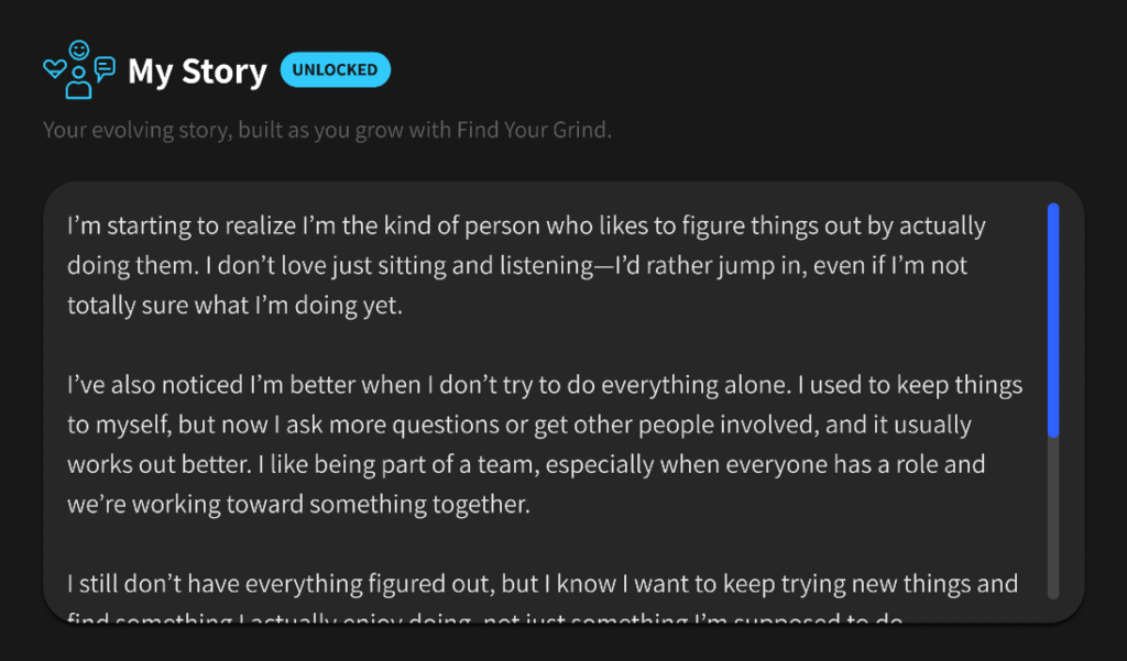 My Story automatically converts student activity—reflections, goals, interests, and engagement—into a clear, first-person profile of who they are right now and where they’re headed.