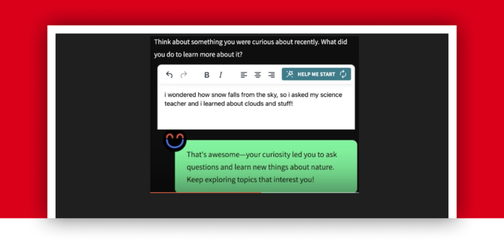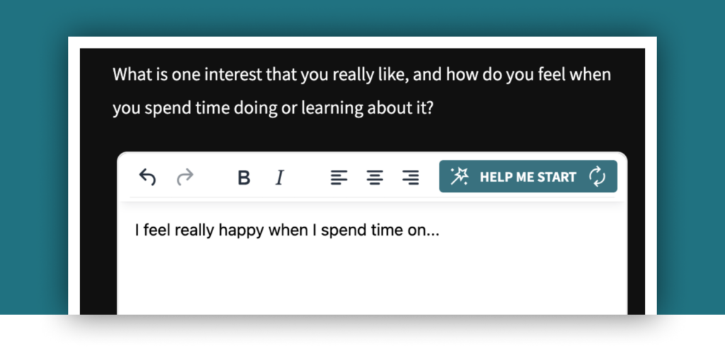 A new “Help me start” button provides guided sentence starters on reflection questions, helping students begin writing and produce more thoughtful, meaningful responses.